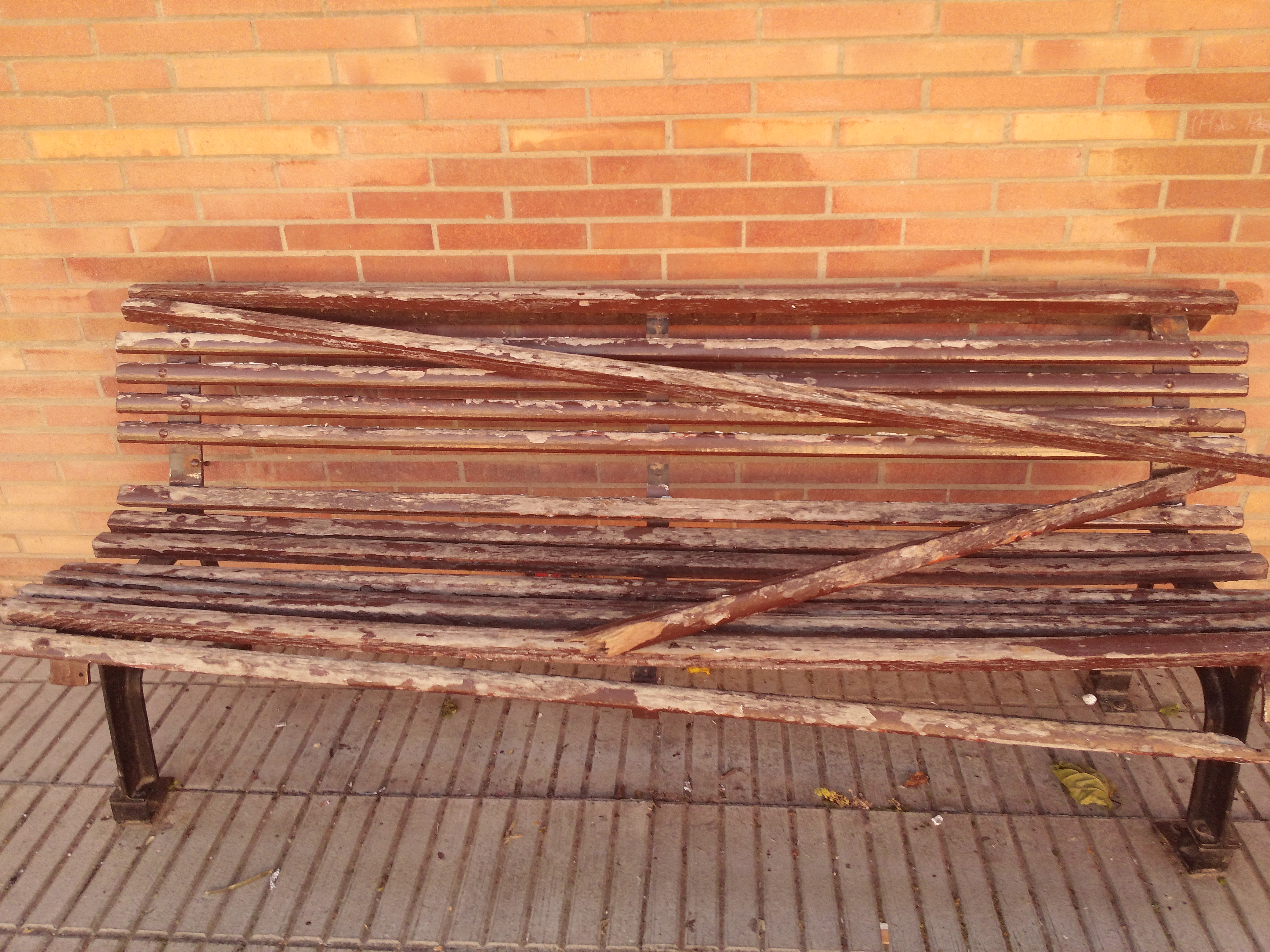 Banc de fusta trencat per diversos llocs.