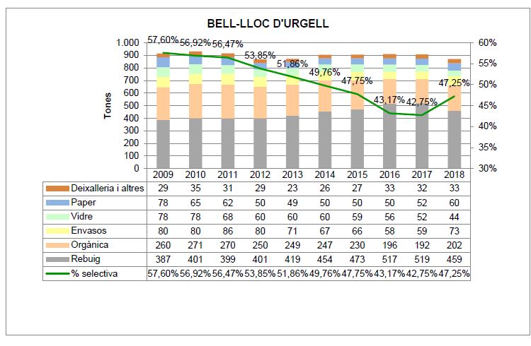 Com es pot observar en el gràfic, la recollida selectiva ha anat empitjorant des del primer any en que es van instal·lar les àrees soterrades. En el cas de Bell-lloc d'Urgell s'ha passat del 57,6% l'any 2009 fins al 42,75% de l'any 2017. El passat 2018 es va invertir aquesta tendència i la recollida selectiva va representar el 47,25% del total, una xifra que s'acosta al 50% establert per la normativa comunitària per a l'any 2020.